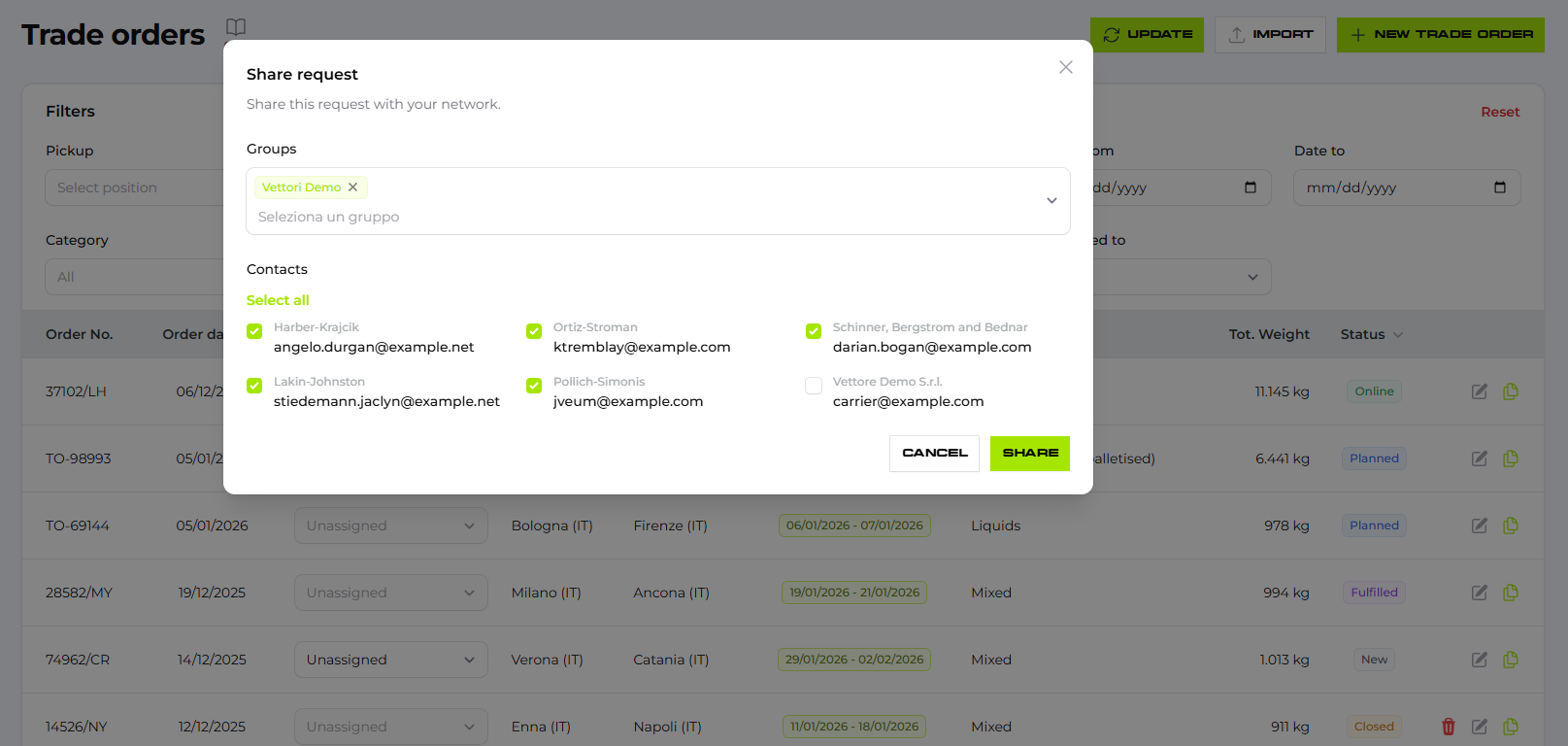 Questa è la funzionalità più potente del Network: condividere una richiesta di trasporto con tutti i vettori di uno o più gruppi con un solo clic.