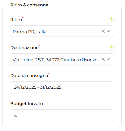 Effetto: Quando cercherai un trasportatore o pubblicherai la richiesta, il sistema userà il Budget Forzato come tetto massimo (cap), ignorando la stima automatica.