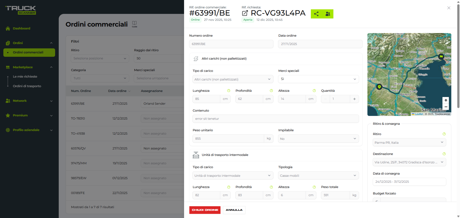"Chiudi Ordine" 🔒 (solo in stato "Online"): Usa se organizzi il trasporto fuori da Truckscanner. L'ordine passa a stato "Chiuso". Eventuali richieste attive vengono annullate.