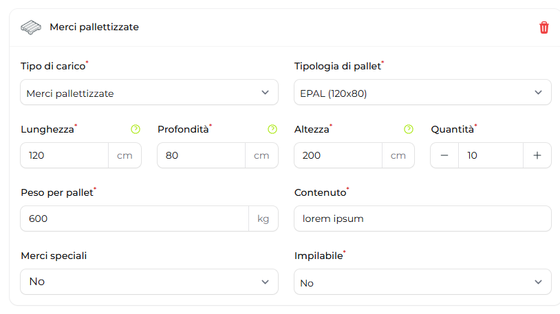 Nota: Passa il mouse sull'icona ? accanto ai campi per visualizzare un'immagine guida delle dimensioni.Quantità* : Indica il numero di unità (es. numero di pallet). Puoi usare i pulsanti + e - per aumentare o diminuire il valore.
